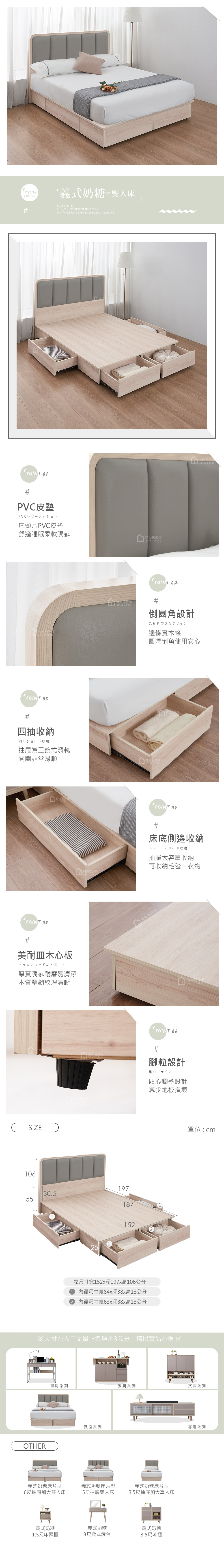 【時尚屋】[VRZ13]義式奶糖四抽床片型5尺雙人床,色系原木奶茶色為主,點綴廚房視覺空間美感,材質上採用美耐皿木心板、三節式滑軌、PVC皮革等,均高於市場之產品規格,品質絕對有保證!此雙人床舒適程度絕對可滿足您的需求!設計質感及耐用性絕對是首選。有了他絕對可以讓您煥然一新!時尚屋帶給您對家具時尚新品味。