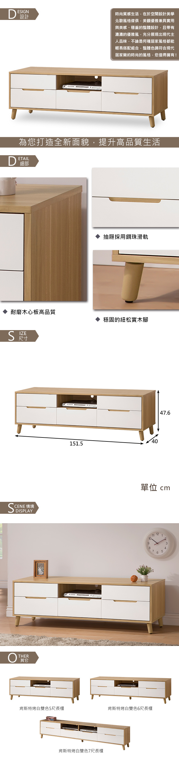 【時尚屋】[NM29]肯詩特烤白雙色5尺長櫃,色系白色為主,點綴客廳視覺空間美感,材質上採用木心板、鋼珠滑軌、紐松實木腳等,均高於市場之產品規格,品質絕對有保證!此長櫃在收納空間上採五抽,絕對可滿足您對收納的需求,設計質感及耐用性絕對是首選。有了他絕對可以讓您煥然一新!時尚屋帶給您對家具時尚新品味。