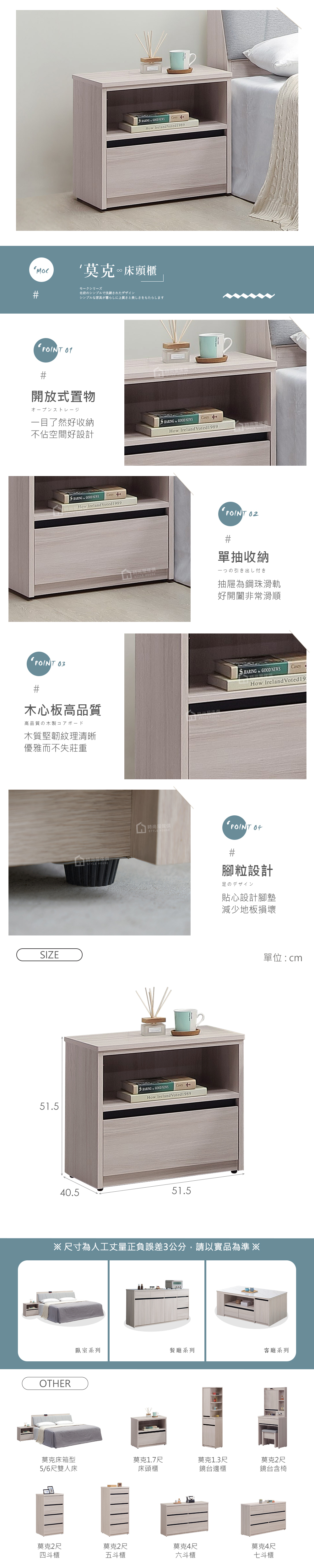 【時尚屋】[DV11]莫克1.7尺床頭櫃,色系奶茶色為主,點綴臥室視覺空間美感,材質上採用木心板、鋼珠滑軌等,均高於市場之產品規格,品質絕對有保證!此床頭櫃在收納空間上採單抽,絕對可滿足您對收納的需求,相當於收納櫃之功能!有了他絕對可以讓您煥然一新!時尚屋帶給您對家具時尚新品味。