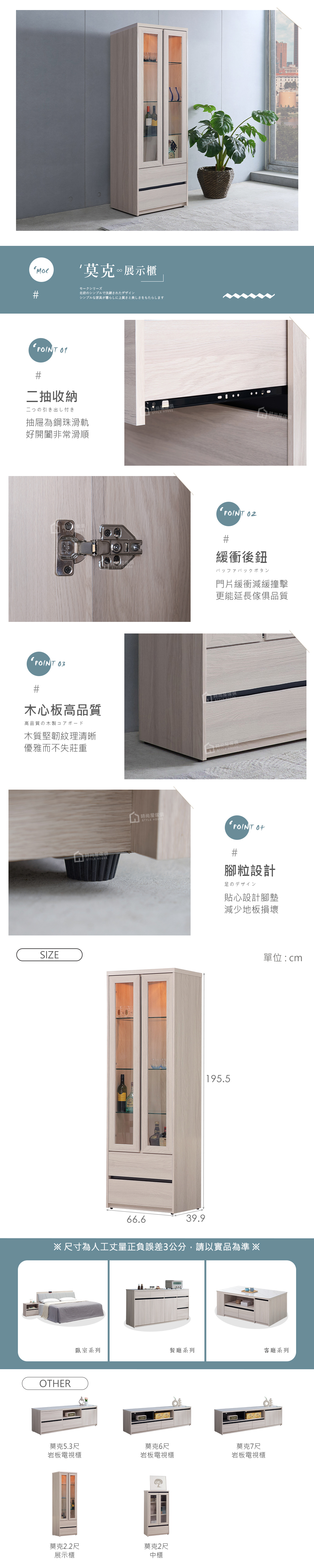【時尚屋】[DV11]莫克2.2尺展示櫃,色系奶茶色為主,點綴客廳視覺空間美感,材質上採用木心板、鋼珠滑軌、緩衝後鈕等,均高於市場之產品規格,品質絕對有保證!此展示櫃在收納空間上採二抽,絕對可滿足您對收納的需求,相當於收納櫃之功能!有了他絕對可以讓您煥然一新!時尚屋帶給您對家具時尚新品味。