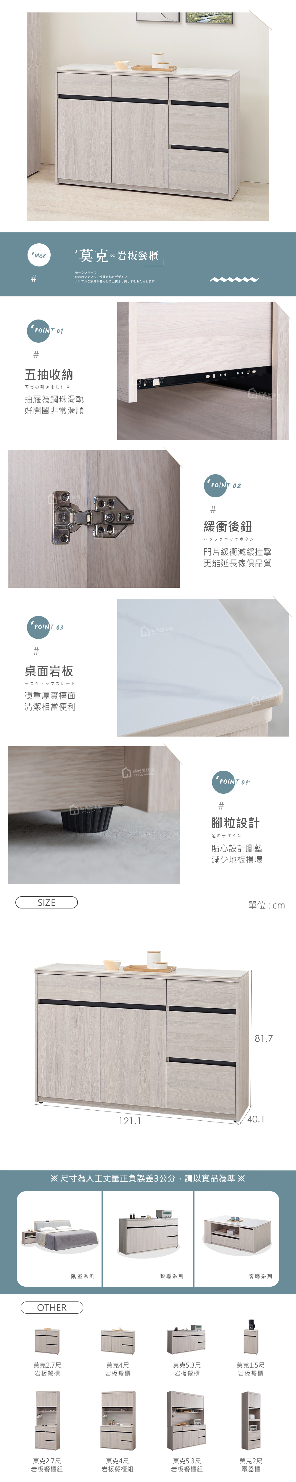 【時尚屋】[DV11]莫克4尺岩板餐櫃,色系奶茶色為主,點綴廚房視覺空間美感,材質上採用木心板、鋼珠滑軌、緩衝後鈕、岩板等,均高於市場之產品規格,品質絕對有保證!此餐櫃在收納空間上採五抽,絕對可滿足您對收納的需求,相當於收納櫃之功能!有了他絕對可以讓您煥然一新!時尚屋帶給您對家具時尚新品味。