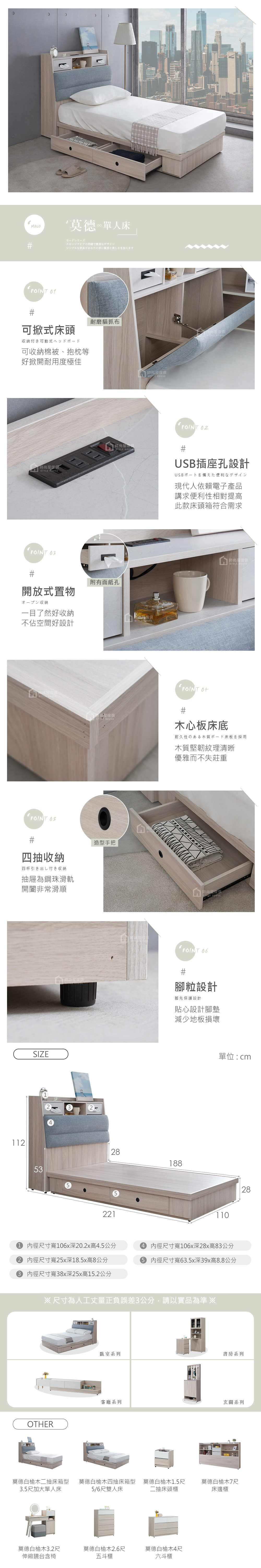【時尚屋】[CW24]莫德白榆木二抽床箱型3.5尺加大單人床,色系白榆木色為主,點綴臥室視覺空間美感,材質上採用木心板、鋼珠滑軌等,均高於市場之產品規格,品質絕對有保證!此床組舒適程度絕對可滿足您的需求!設計質感及耐用性絕對是首選。有了他絕對可以讓您煥然一新!時尚屋帶給您對家具時尚新品味。