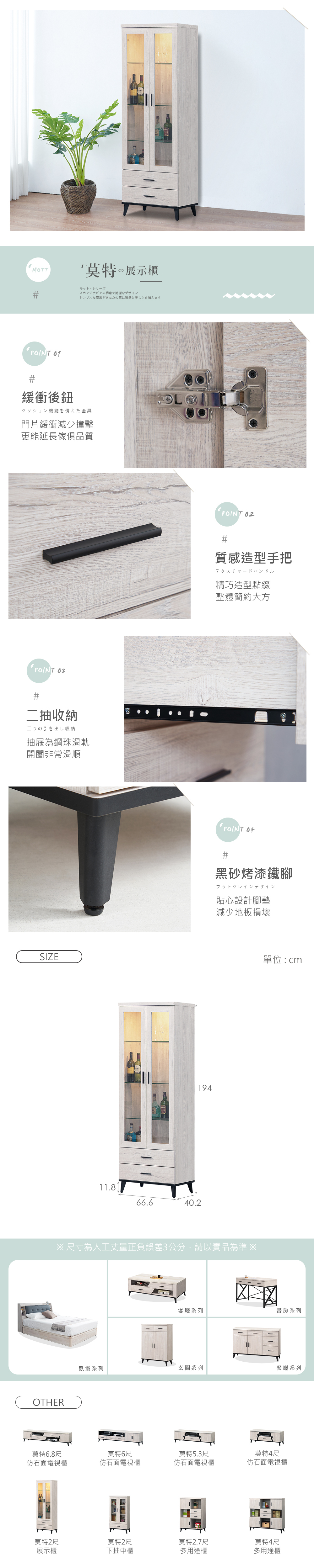 【時尚屋】[DV10]莫特2尺展示櫃,色系白橡色為主,點綴客廳視覺空間美感,材質上採用木心板、緩衝後鈕、鋼珠滑軌、黑砂烤漆鐵腳等,均高於市場之產品規格,品質絕對有保證!此展示櫃在收納空間上採雙開門+二抽,絕對可滿足您對收納的需求,相當於收納櫃之功能!有了他絕對可以讓您煥然一新!時尚屋帶給您對家具時尚新品味。