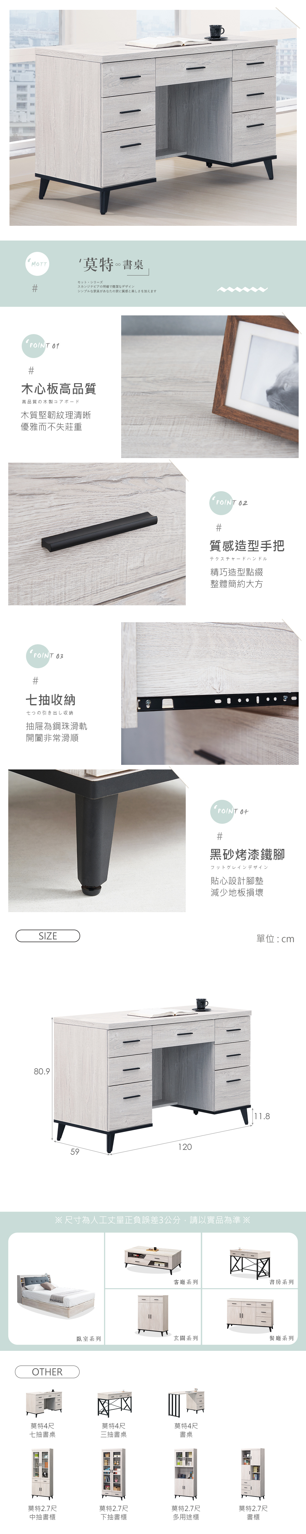 【時尚屋】[DV10]莫特4尺七抽書桌,色系白橡色為主,點綴書房視覺空間美感,材質上採用木心板、鋼珠滑軌、黑砂烤漆鐵腳等,均高於市場之產品規格,品質絕對有保證!此書桌在收納空間上採七抽,絕對可滿足您對收納的需求,相當於收納櫃之功能!有了他絕對可以讓您煥然一新!時尚屋帶給您對家具時尚新品味。
