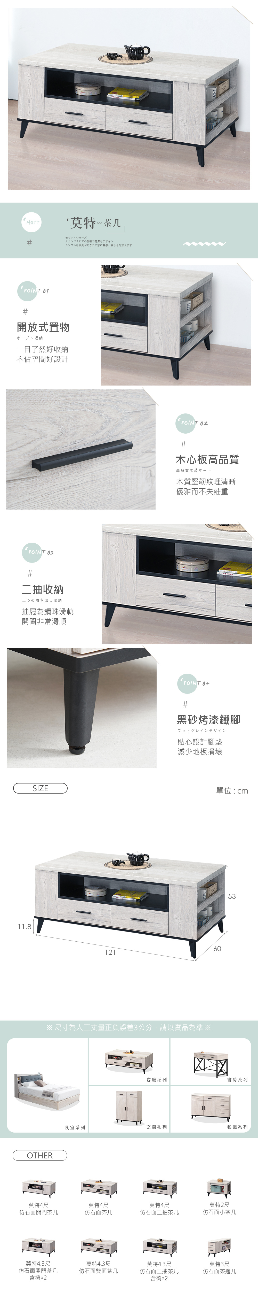 【時尚屋】[DV10]莫特4尺仿石面二抽茶几,色系白橡色為主,點綴客廳視覺空間美感,材質上採用木心板、仿石紋面、鋼珠滑軌、黑砂烤漆鐵腳等,均高於市場之產品規格,品質絕對有保證!此茶几在收納空間上採二抽,絕對可滿足您對收納的需求,相當於收納櫃之功能!有了他絕對可以讓您煥然一新!時尚屋帶給您對家具時尚新品味。