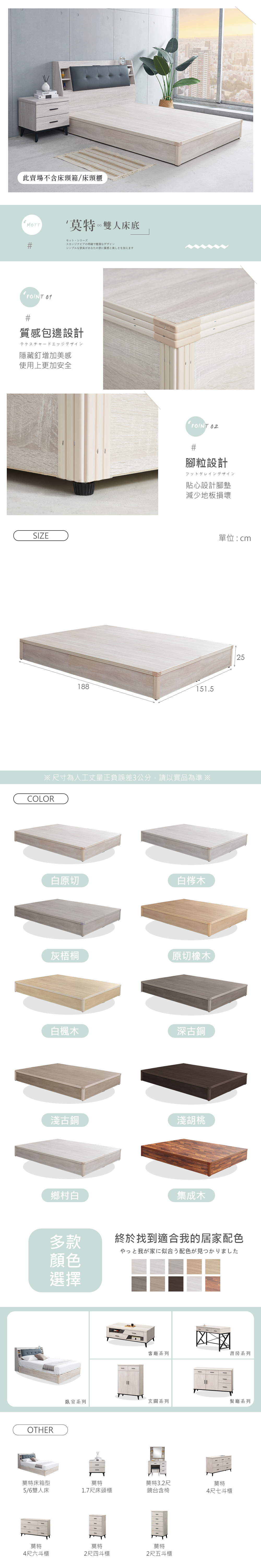 【時尚屋】[UZR11]莫特白原切5尺雙人床底,色系白橡色為主,點綴臥室視覺空間美感,材質上採用木心板、三分板等,均高於市場之產品規格,品質絕對有保證!此床架舒適程度絕對可滿足您的需求!設計質感及耐用性絕對是首選。有了他絕對可以讓您煥然一新!時尚屋帶給您對家具時尚新品味。