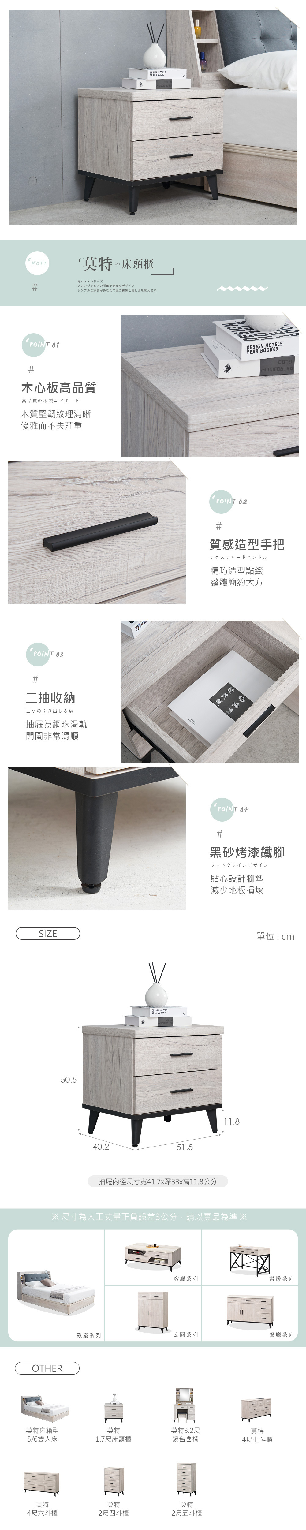 【時尚屋】[DV10]莫特白橡1.7尺床頭櫃,色系白橡色為主,點綴臥室視覺空間美感,材質上採用木心板、鋼珠滑軌、黑砂烤漆鐵腳等,均高於市場之產品規格,品質絕對有保證!此床頭櫃在收納空間上採二抽,絕對可滿足您對收納的需求,相當於收納櫃之功能!有了他絕對可以讓您煥然一新!時尚屋帶給您對家具時尚新品味。