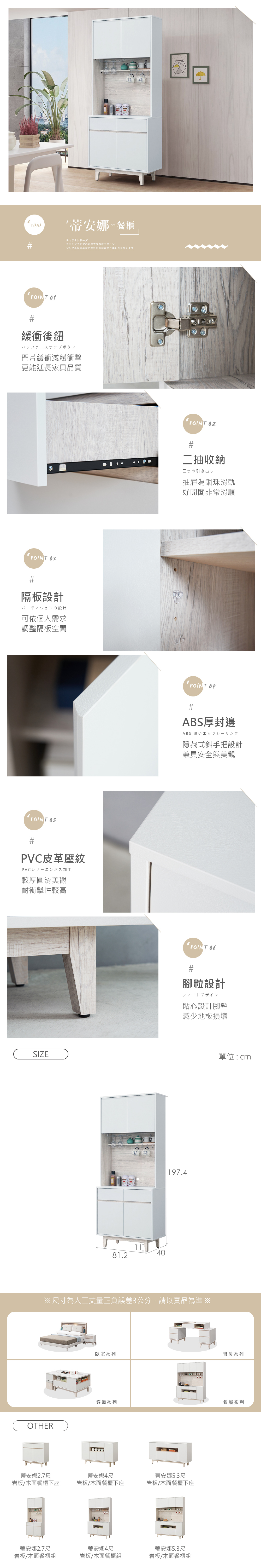【時尚屋】[MX22]蒂安娜2.7尺餐櫃組,色系奶灰色為主,點綴廚房視覺空間美感,材質上採用木心板、緩衝後鈕、鋼珠滑軌、ABS封邊等,均高於市場之產品規格,品質絕對有保證!此餐櫃在收納空間上採二抽+雙開門,絕對可滿足您對收納的需求,相當於收納櫃之功能!有了他絕對可以讓您煥然一新!時尚屋帶給您對家具時尚新品味。