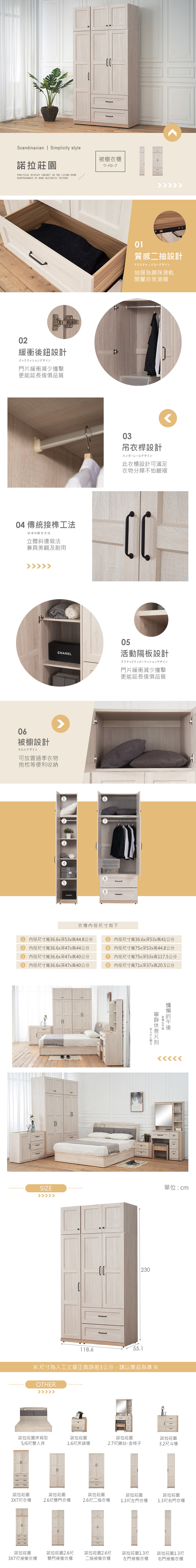 【時尚屋】[RT9]諾拉莊園3.9尺左門二抽被櫥衣櫃,色系以白原切色為主,點綴臥室視覺空間美感,材質上採用木心板、緩衝後鈕、鋼珠滑軌等,均高於市場之產品規格,品質絕對有保證!此衣櫃在收納空間上採二支吊衣桿+單開門+雙開門+二抽,此衣櫃絕對可滿足您對收納的需求,相當於收納櫃之功能!設計質感及耐用性絕對是首選。有了他絕對可以讓您煥然一新!時尚屋帶給您對家具時尚新品味。