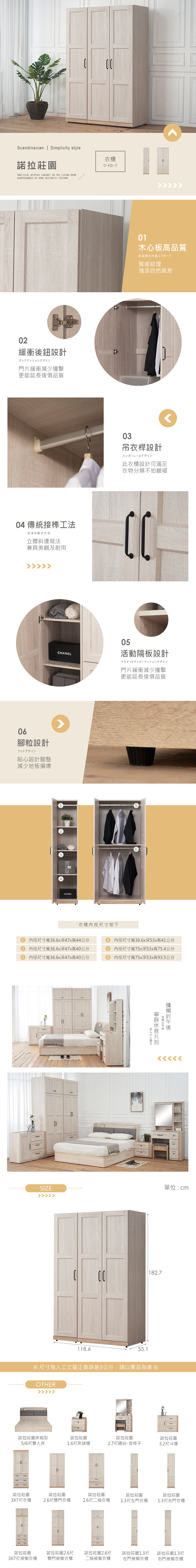【時尚屋】[RT9]諾拉莊園3.9尺左門雙門衣櫃,色系以白原切色為主,點綴臥室視覺空間美感,材質上採用木心板、緩衝後鈕等,均高於市場之產品規格,品質絕對有保證!此衣櫃在收納空間上採三支吊衣桿+單開門+雙開門,此衣櫃絕對可滿足您對收納的需求,相當於收納櫃之功能!設計質感及耐用性絕對是首選。有了他絕對可以讓您煥然一新!時尚屋帶給您對家具時尚新品味。