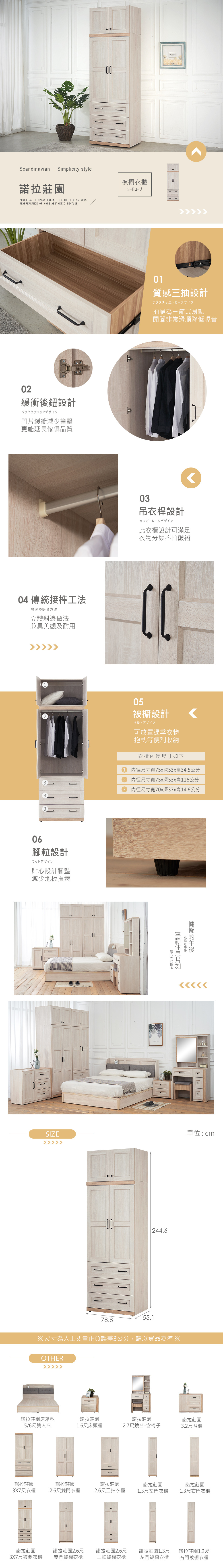 | 名稱:諾拉莊園3x7尺被櫥衣櫃 型號:RT9-A011+A012 內容:木心板、緩衝後鈕、三節式滑軌 尺寸:寬78.8x深55.1x高244.6公分 【時尚屋】[RT9]諾拉莊園3x7尺被櫥衣櫃,色系以白原切色為主,點綴臥室視覺空間美感,材質上採用木心板、緩衝後鈕、三節式滑軌等,均高於市場之產品規格,品質絕對有保證!此衣櫃在收納空間上採單支吊衣桿+雙開門+三抽,此衣櫃絕對可滿足您對收納的需求,相當於收納櫃之功能!設計質感及耐用性絕對是首選。有了他絕對可以讓您煥然一新!時尚屋帶給您對家具時尚新品味。 ◆採用符合標準材質讓你用的安心。 ◆此商品不需要DIY組立,此商品為組立後之成品。 ◆品質保證、專業設計、貼心服務。 ◆全由專人配送到家,專業安心服務,替你省下更多時間。 |