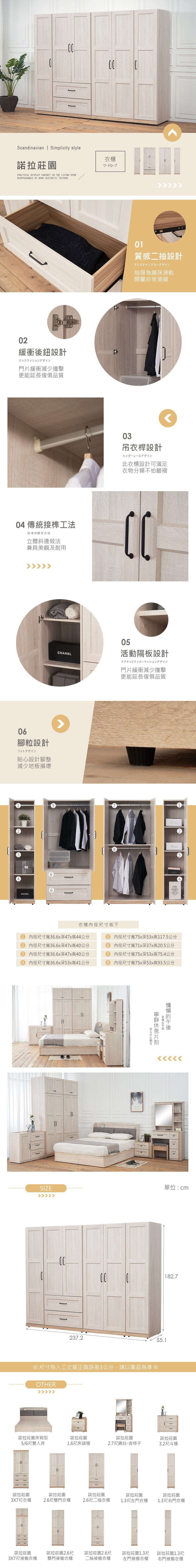 【時尚屋】[RT9]諾拉莊園7.9尺衣櫃,色系以白原切色為主,點綴臥室視覺空間美感,材質上採用木心板、緩衝後鈕、鋼珠滑軌等,均高於市場之產品規格,品質絕對有保證!此衣櫃在收納空間上採五支吊衣桿+單開門+雙開門+二抽,此衣櫃絕對可滿足您對收納的需求,相當於收納櫃之功能!設計質感及耐用性絕對是首選。有了他絕對可以讓您煥然一新!時尚屋帶給您對家具時尚新品味。