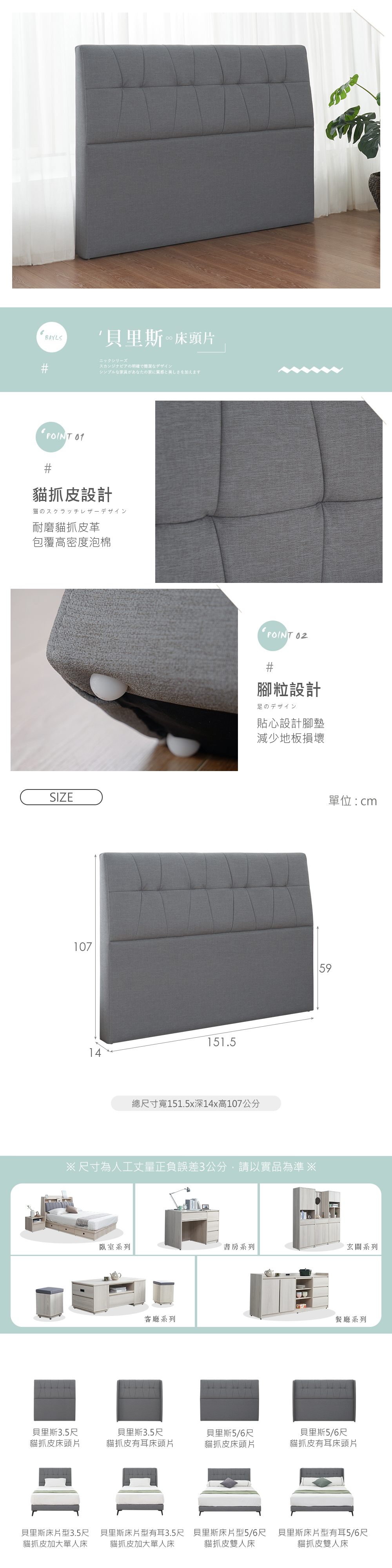 【時尚屋】[5V25]貝里斯5尺貓抓皮床頭片,色系灰色為主,點綴臥室視覺空間美感,材質上採用貓抓皮革、高密度泡棉、實木框架等,均高於市場之產品規格,品質絕對有保證!此床頭片舒適程度絕對可滿足您的需求!設計質感及耐用性絕對是首選。有了他絕對可以讓您煥然一新!時尚屋帶給您對家具時尚新品味。