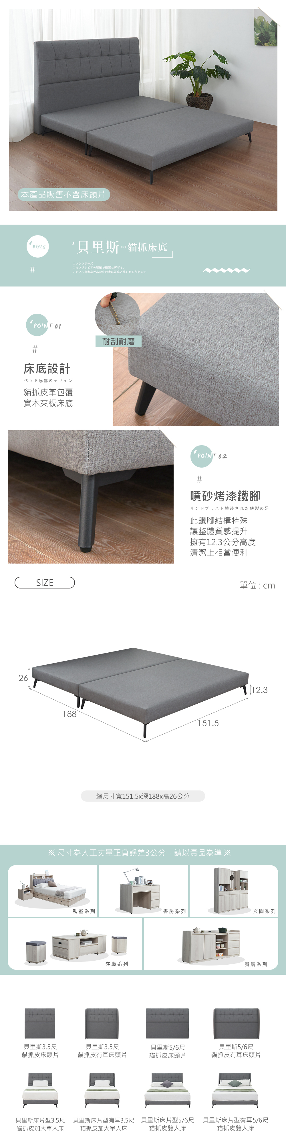 【時尚屋】[5V25]貝里斯5尺貓抓皮雙人床底,色系灰色為主,點綴臥室視覺空間美感,材質上採用貓抓皮革、高密度泡棉、框架實木夾板、噴砂烤漆鐵腳等,均高於市場之產品規格,品質絕對有保證!此床底舒適程度絕對可滿足您的需求!設計質感及耐用性絕對是首選。有了他絕對可以讓您煥然一新!時尚屋帶給您對家具時尚新品味。
