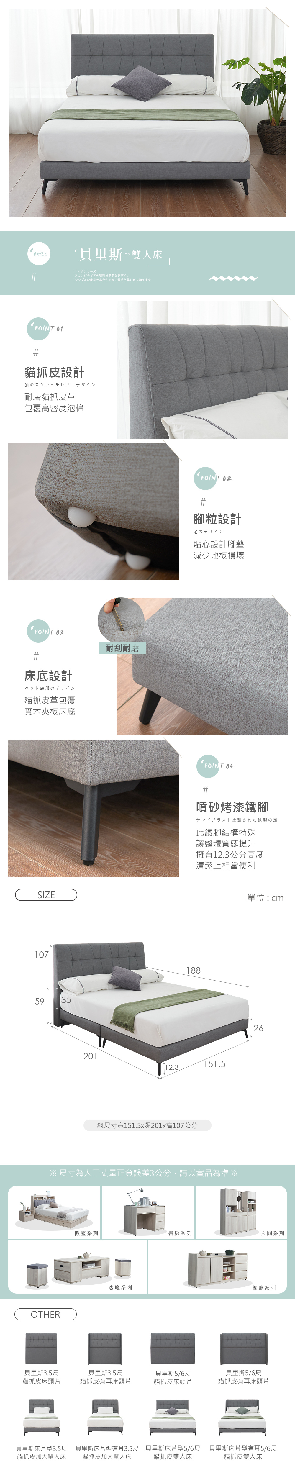 【時尚屋】[5V25]貝里斯床片型5尺貓抓皮雙人床,色系灰色為主,點綴臥室視覺空間美感,材質上採用貓抓皮革、高密度泡棉、框架實木夾板、噴砂烤漆鐵腳等,均高於市場之產品規格,品質絕對有保證!此雙人床舒適程度絕對可滿足您的需求!設計質感及耐用性絕對是首選。有了他絕對可以讓您煥然一新!時尚屋帶給您對家具時尚新品味。