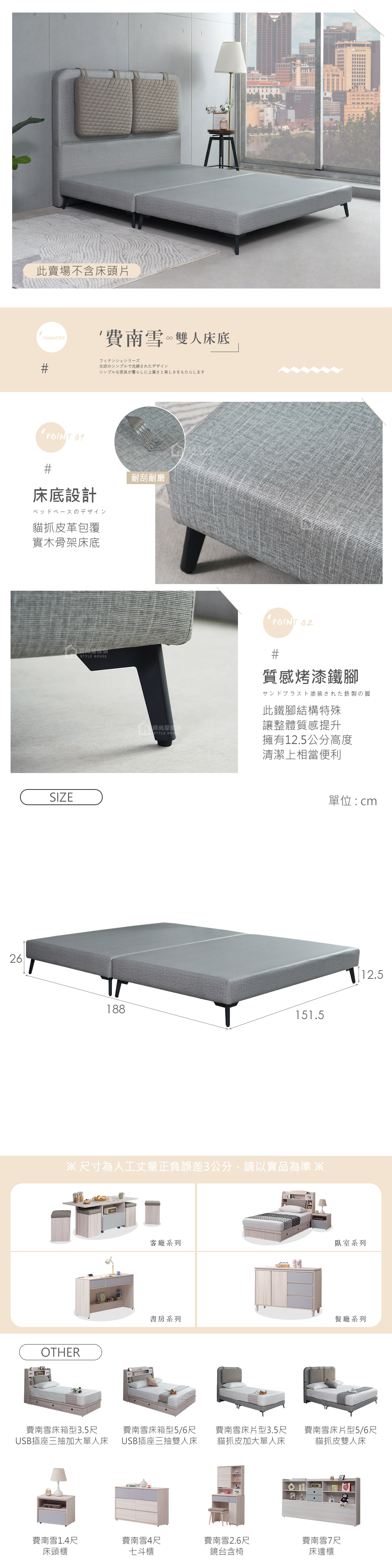 【時尚屋】[5V25]費南雪5尺貓抓皮雙人床底,色系灰色為主,點綴臥室視覺空間美感,材質上採用貓抓皮革、高密度泡棉、實木骨架、烤漆鐵腳等,均高於市場之產品規格,品質絕對有保證!此床底舒適程度絕對可滿足您的需求!設計質感及耐用性絕對是首選。有了他絕對可以讓您煥然一新!時尚屋帶給您對家具時尚新品味。