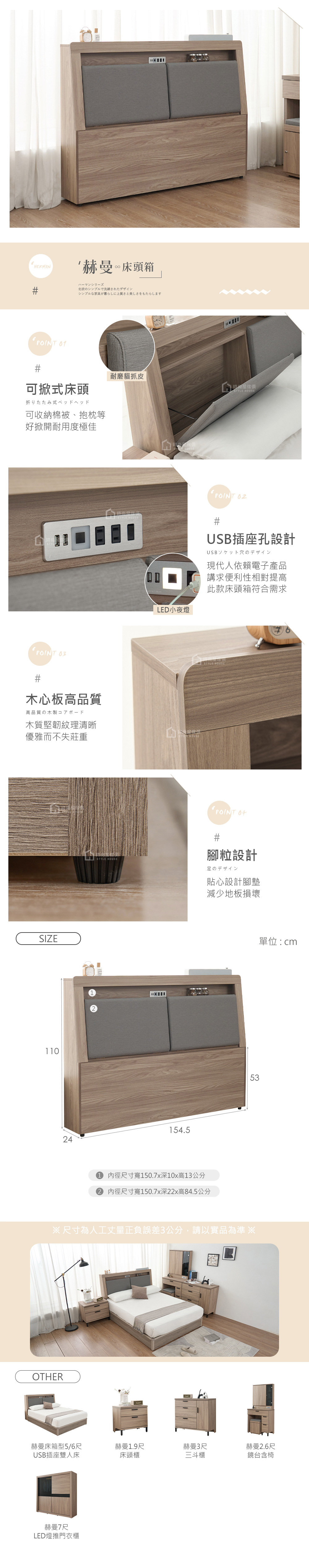 【時尚屋】[UT14]赫曼5尺USB插座床頭箱,色系古橡木色為主,點綴臥室視覺空間美感,材質上採用木心板、ABS封邊等,均高於市場之產品規格,品質絕對有保證!此床頭箱舒適程度絕對可滿足您的需求!設計質感及耐用性絕對是首選。有了他絕對可以讓您煥然一新!時尚屋帶給您對家具時尚新品味。