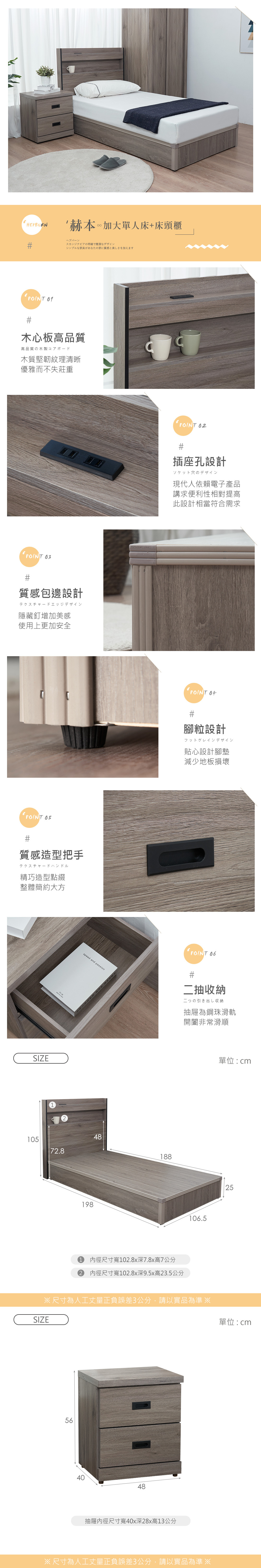 尺寸:單人床-寬106.5x深198x高105公分、床頭櫃-寬48x深40x高56公分