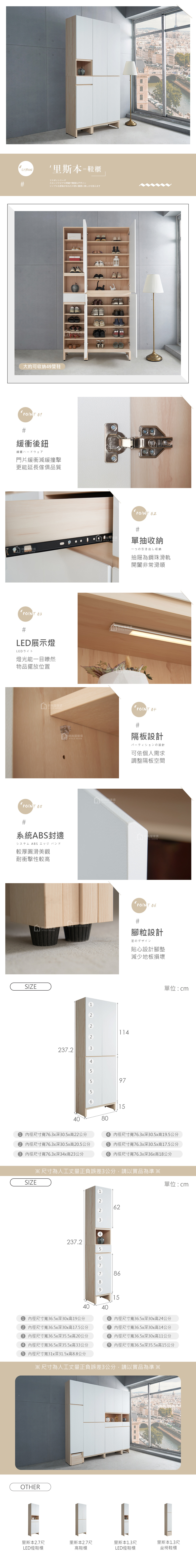 【時尚屋】[CT23]里斯本4尺LED燈高鞋櫃,色系白橡色為主,點綴客廳視覺空間美感,材質上採用木心板、緩衝後鈕、鋼珠滑軌等,均高於市場之產品規格,品質絕對有保證!此鞋櫃在收納空間上採單抽+單雙開門,絕對可滿足您對收納的需求,相當於收納櫃之功能!有了他絕對可以讓您煥然一新!時尚屋帶給您對家具時尚新品味。