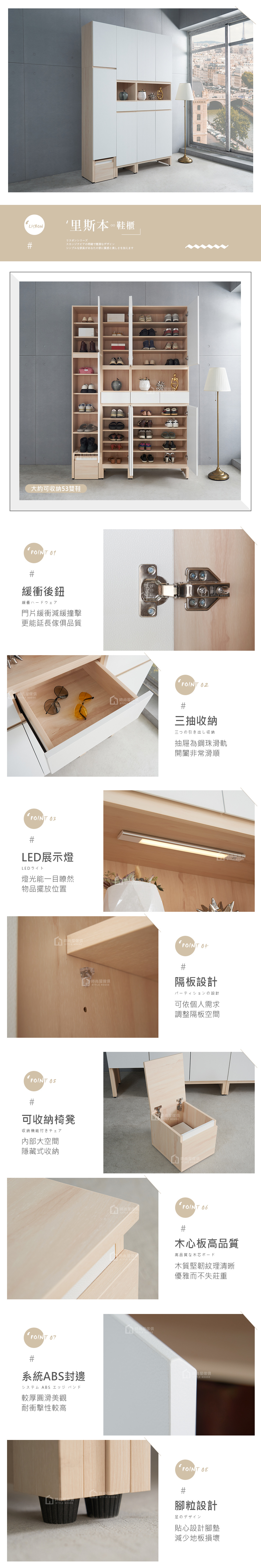 【時尚屋】[CT23]里斯本5.3尺LED燈坐鞋櫃,色系白橡色為主,點綴客廳視覺空間美感,材質上採用木心板、緩衝後鈕、鋼珠滑軌等,均高於市場之產品規格,品質絕對有保證!此鞋櫃在收納空間上採三抽+單雙開門,絕對可滿足您對收納的需求,相當於收納櫃之功能!有了他絕對可以讓您煥然一新!時尚屋帶給您對家具時尚新品味。