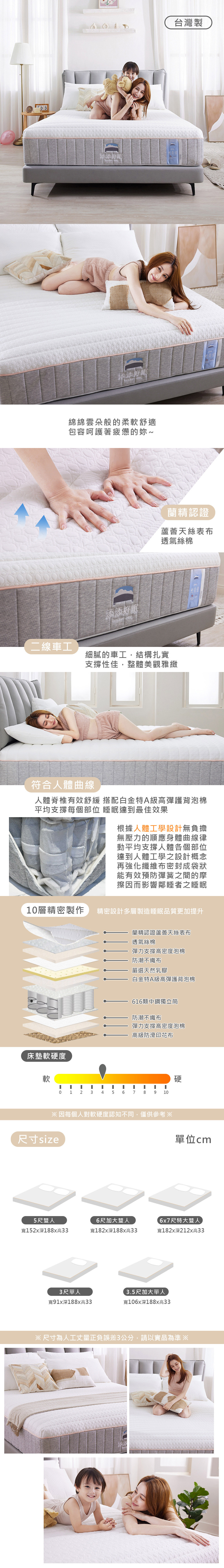 名稱:雲眠眠3.5尺白金棉天然乳膠獨立筒床墊