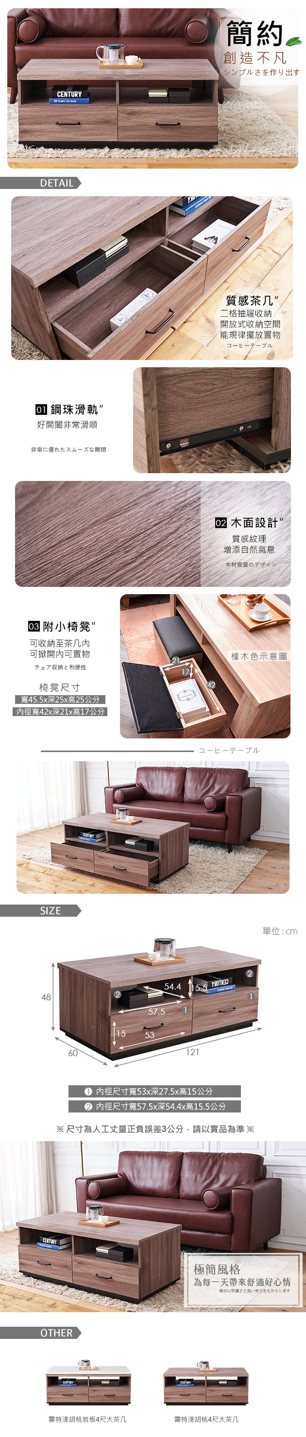 【時尚屋】[MX9]霍特淺胡桃4尺大茶几,色系淺胡桃色為主,點綴客廳視覺空間美感,材質上採用木心板、鋼珠滑軌等,均高於市場之產品規格,品質絕對有保證!此茶几在收納空間上採二抽,絕對可滿足您對收納的需求,設計質感及耐用性絕對是首選。有了他絕對可以讓您煥然一新!時尚屋帶給您對家具時尚新品味。