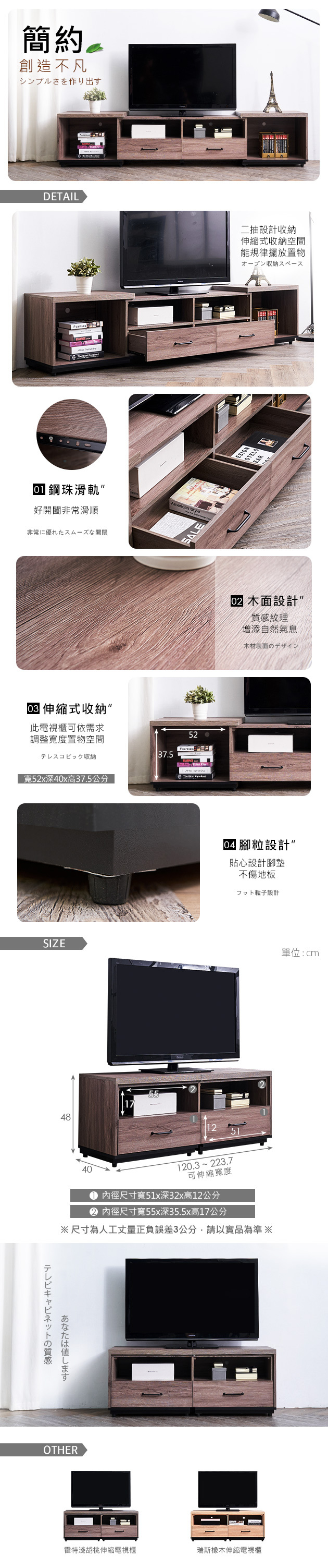 【時尚屋】[MX9]霍特淺胡桃伸縮電視櫃,色系淺胡桃色為主,點綴客廳視覺空間美感,材質上採用木心板、鋼珠滑軌等,均高於市場之產品規格,品質絕對有保證!此電視櫃在收納空間上採二抽,絕對可滿足您對收納的需求,相當於收納櫃之功能!有了他絕對可以讓您煥然一新!時尚屋帶給您對家具時尚新品味。