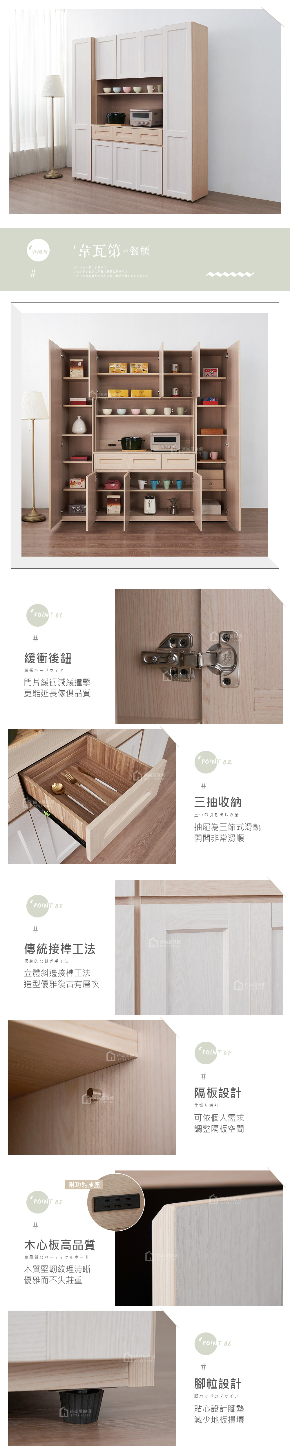【時尚屋】[RT9]韋瓦第6.6尺餐櫃組,色系白原切色為主,點綴廚房視覺空間美感,材質上採用木心板、緩衝後鈕、三節式滑軌等,均高於市場之產品規格,品質絕對有保證!此餐櫃組在收納空間上採三抽,絕對可滿足您對收納的需求,相當於收納櫃之功能!有了他絕對可以讓您煥然一新!時尚屋帶給您對家具時尚新品味。