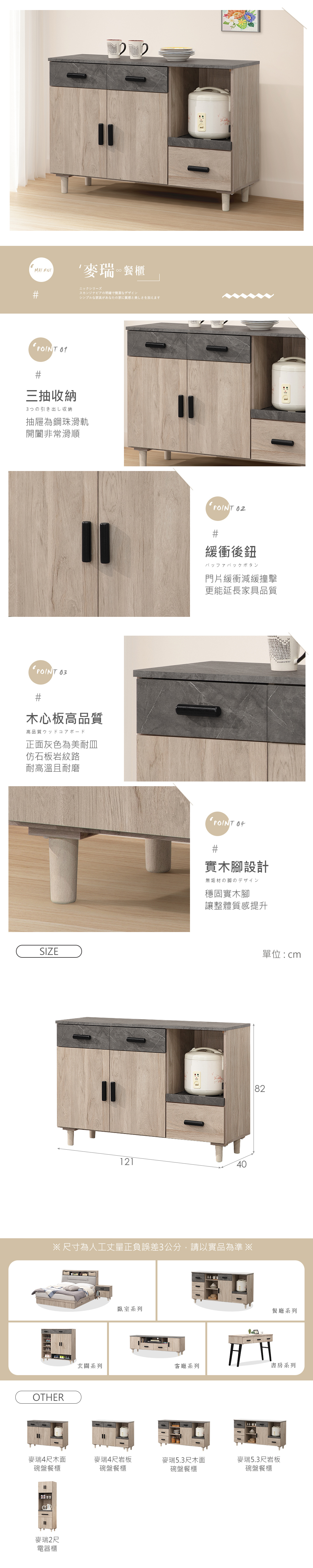 【時尚屋】[CW23]麥瑞4尺木面碗盤餐櫃,色系橡木色為主,點綴廚房視覺空間美感,材質上採用木心板、緩衝後鈕、鋼珠滑軌、實木腳等,均高於市場之產品規格,品質絕對有保證!此餐櫃在收納空間上採三抽+雙開門,絕對可滿足您對收納的需求,相當於收納櫃之功能!有了他絕對可以讓您煥然一新!時尚屋帶給您對家具時尚新品味。