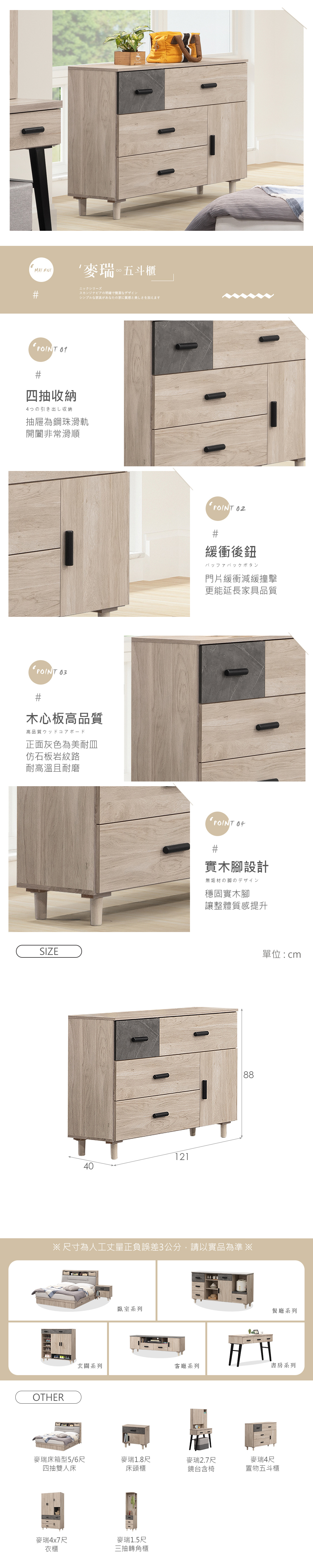 【時尚屋】[CW23]麥瑞4尺置物五斗櫃,色系橡木色為主,點綴臥室視覺空間美感,材質上採用木心板、鋼珠滑軌、緩衝後鈕、實木腳等,均高於市場之產品規格,品質絕對有保證!此斗櫃在收納空間上採四抽,絕對可滿足您對收納的需求,相當於收納櫃之功能!有了他絕對可以讓您煥然一新!時尚屋帶給您對家具時尚新品味。